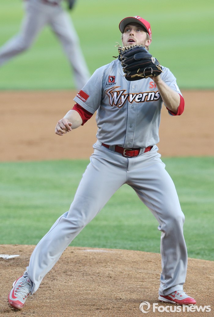 (서울=포커스뉴스) 13일 서울 잠실구장에서 열린 2016 프로야구 SK-LG 경기에서 1회말 SK 선발투수 켈리가 LG 정성훈의 바운드가 큰 타구를 잡으려 바라보고 있다.