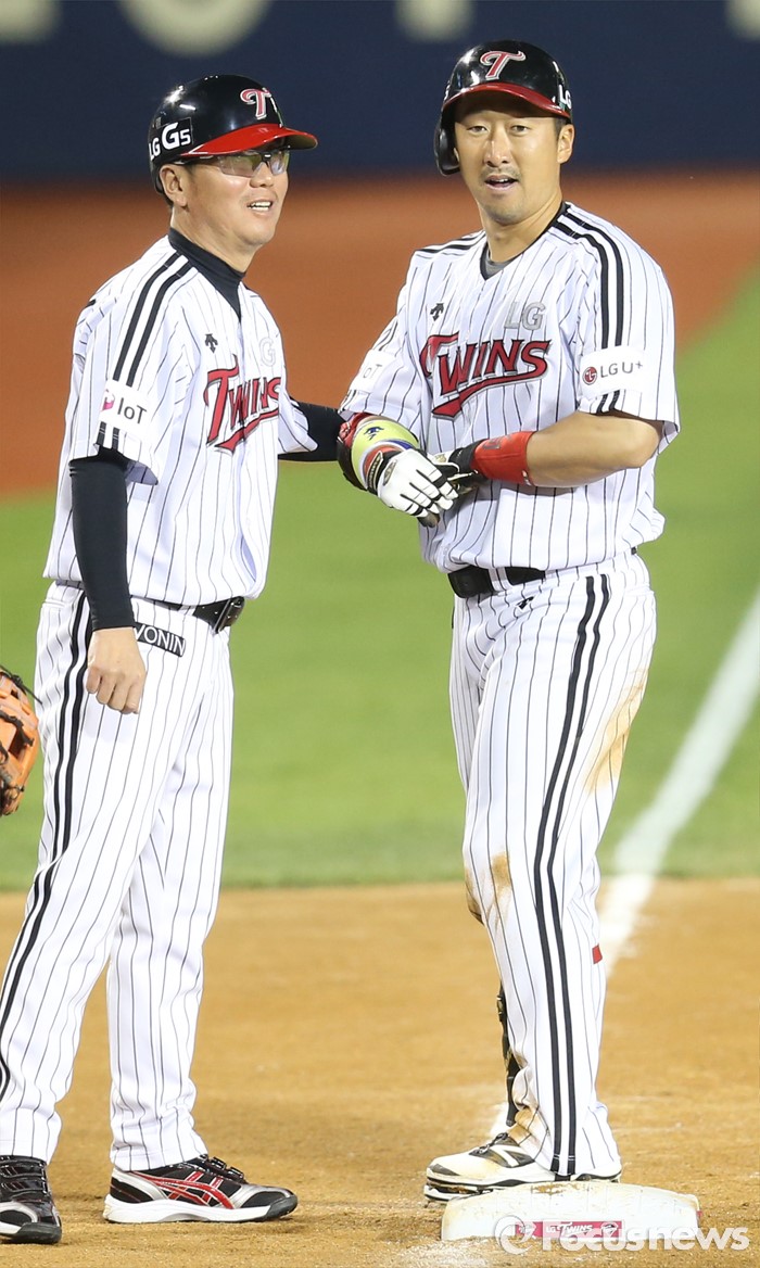 (서울=포커스뉴스) 13일 서울 잠실구장에서 열린 2016 프로야구 SK-LG 경기 6회말 LG 선두타자 이병규가 중견수를 넘기는 3루타를 치고 3루에서 유지현 코치의 축하를 받고 있다.