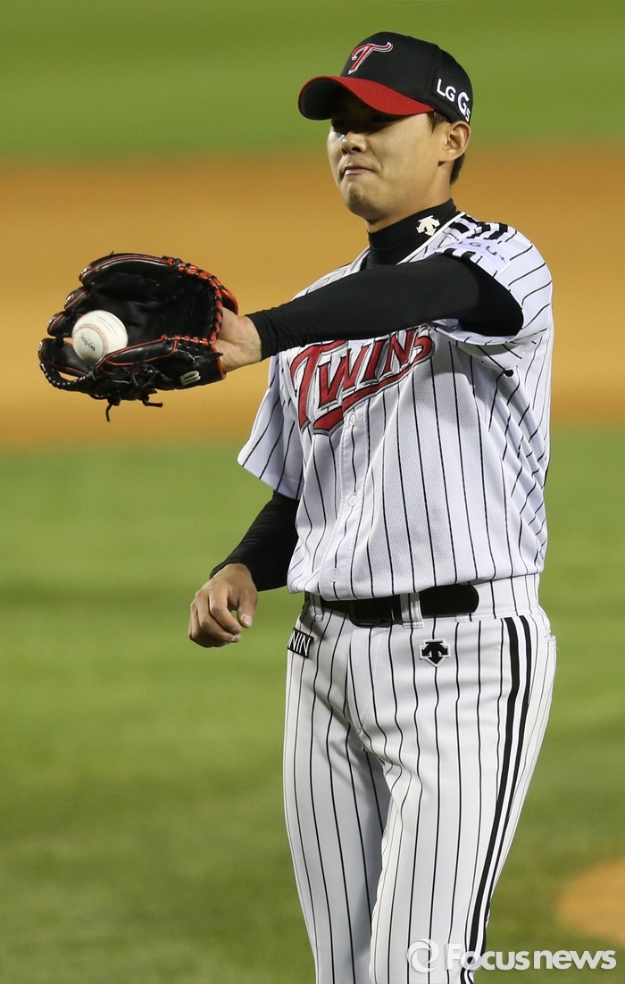(서울=포커스뉴스) 13일 서울 잠실구장에서 열린 2016 프로야구 SK-LG 경기에서 SK를 2-1로 물리친 LG의 마무리 투수 임정우가 SK 마지막 타자 고메즈를 삼진 아웃 시킨 볼을 포수 정상호에게 돌려 받고 있다.