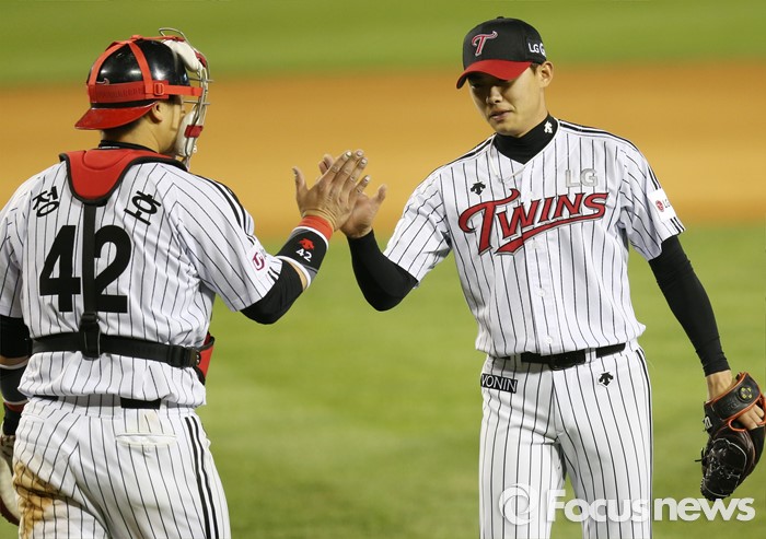 (서울=포커스뉴스) 13일 서울 잠실구장에서 열린 2016 프로야구 SK-LG 경기에서 SK를 2-1로 물리친 LG의 마무리 투수 임정우와 포수 정상호가 하이파이브하고 있다.