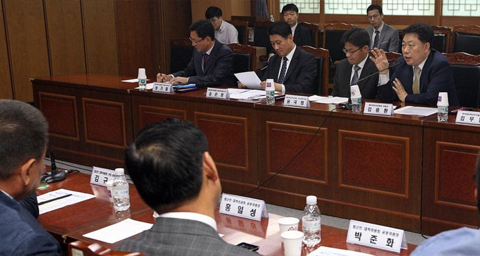 (영광=포커스뉴스) 김용환 원자력안전위원회 위원장이 13일 전남 영광군청 영상회의실에서 열린 영광군 범군민대책위원회 간담회에 참석해 위원들의 질문에 답변을 하고 있다. <사진제공=원자력안전위원회>