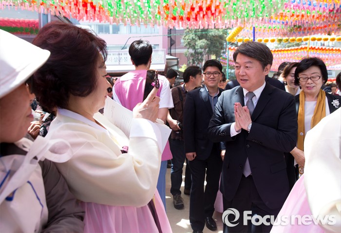 (서울=포커스뉴스) 14일 오전 서울 종로구 조계사 대웅전에서 열린 불기 2560년 부처님 오신날 봉축 법요식에서 안철수 국민의당 상임공동대표가 불교신자들과 인사를 나누고 있다.