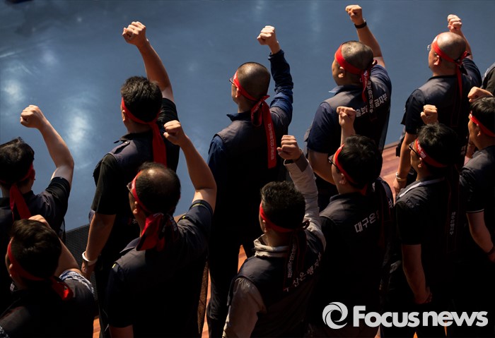 (서울=포커스뉴스) 14일 오후 서울 강서구 KBS스포츠월드에서 성과연봉제 저지를 위한 금융공기업지부 합동 대의원대회에 참석한 금융노조 조합원들이 구호를 외치고 있다.