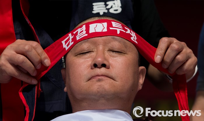 (서울=포커스뉴스) 14일 오후 서울 강서구 KBS스포츠월드에서 성과연봉제 저지를 위한 금융공기업지부 합동 대의원대회에 참석한 김문호 금융노조 위원장이 총파업을 결의하며 삭발식을 하고 있다.