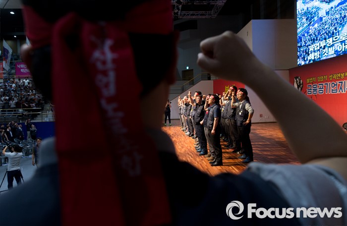 (서울=포커스뉴스) 14일 오후 서울 강서구 KBS스포츠월드에서 성과연봉제 저지를 위한 금융공기업지부 합동 대의원대회에 참석한 금융노조 조합원들이 구호를 외치고 있다.