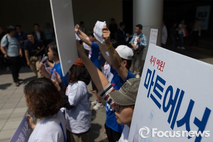 (서울=포커스뉴스) 15일 오전 서울 용산구의 한 대형마트 앞에서 환경운동연합원들이 옥시 불매를 촉구하며 기자회견을 하고 있다.