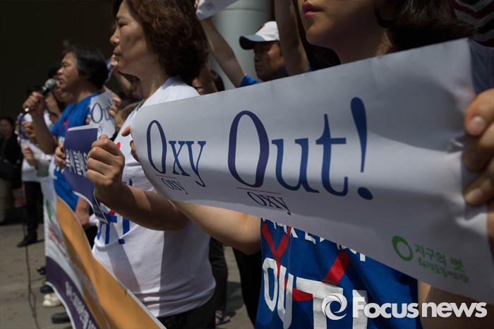 (서울=포커스뉴스) 15일 오전 서울 용산구의 한 대형마트 앞에서 환경운동연합원들이 옥시 불매를 촉구하며 기자회견을 하고 있다.