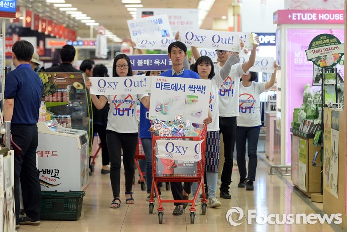 (서울=포커스뉴스) 15일 오전 서울 용산구의 한 대형마트에서 환경운동연합 회원들이 옥시제품 판매 즉각 철수를 촉구하며 불매운동 퍼포먼스를 하고 있다.