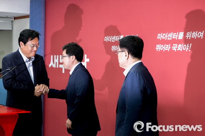(서울=포커스뉴스) 정진석(왼쪽) 새누리당 원내대표와 혁신위원장으로 임명된 김용태(가운데) 의원이 15일 오후 서울 여의도 당사에서 기자회견을 마친 뒤 악수하고 있다. 오른쪽은 김광림 정책위의장.