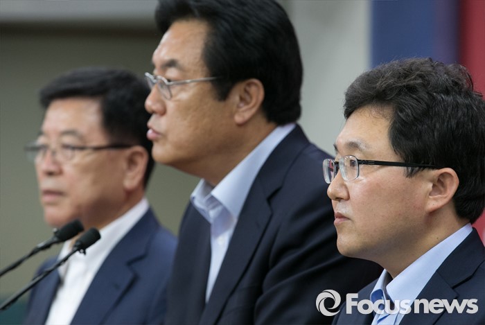 (서울=포커스뉴스) 정진석(가운데) 새누리당 원내대표와 김광림(왼쪽) 정책위의장이 15일 오후 서울 여의도 당사에서 혁신위원장으로 임명된 김용태 의원과 함께 기자회견을 하고 있다.