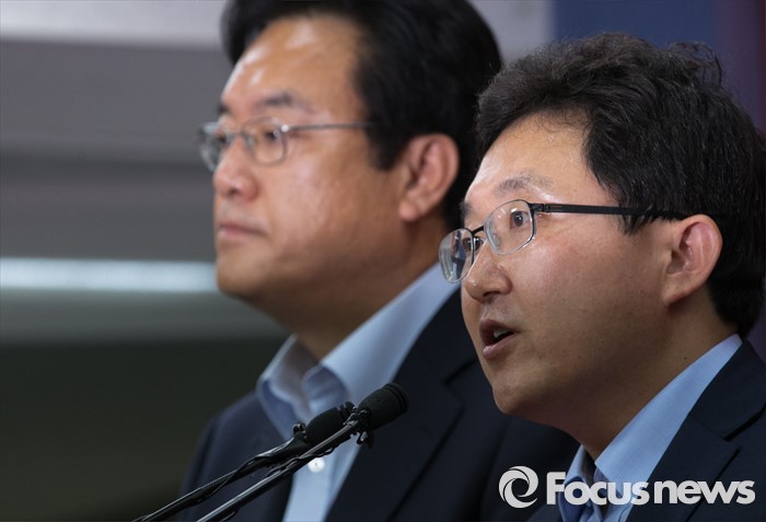 (서울=포커스뉴스) 새누리당 혁신위원장으로 임명된 김용태(오른쪽) 의원이 15일 오후 서울 여의도 당사에서 정진석 원내대표와 함께 기자회견을 하고 있다.