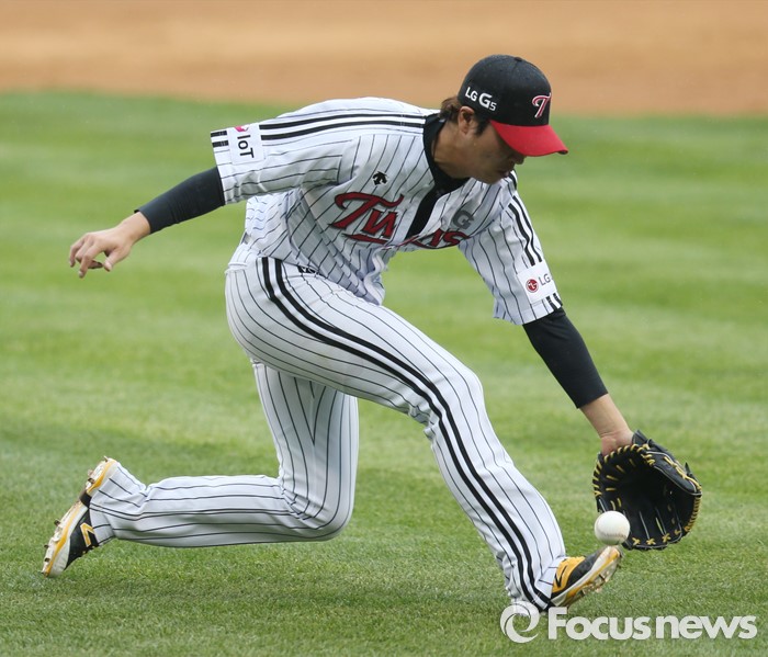 (서울=포커스뉴스) 15일 서울 잠실구장에서 열린 2016 프로야구 SK-LG 경기 2회초 1사 1,2루애서 SK 김성현의 내야땅볼을 LG 투수 우규민이 잡으려 하고 있다. 우규민은 미끄러져 넘이지며 볼을 놓쳤다.
