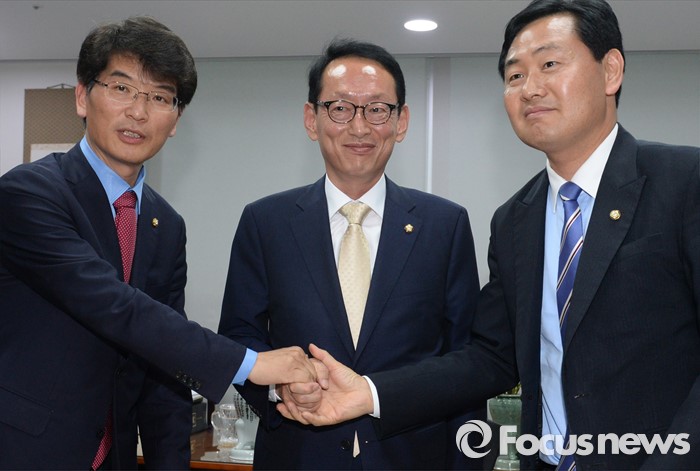 (서울=포커스뉴스) 김도읍(가운데) 새누리당 원내수석부대표, 박완주(왼쪽) 더불어민주당 원내수석부대표, 김관영 국민의당 원내수석부대표가 15일 오후 서울 여의도 국회 의원회관에서 19대 국회 마지막 본회의 안건 및 20대 국회 원구성 협상 등을 논의하기에 앞서 취재진을 향해 포즈를 취하고 있다.