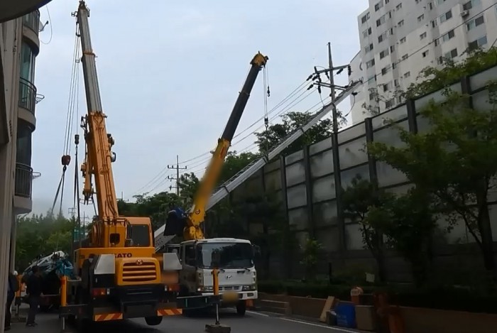 경찰과 소방당국은 사다리차가 이삿짐 무게를 이기지 못하고 차도쪽으로 기울어지진 것으로 보고 정확한 사고 원인을 조사중이다.15일 오전 11시40분쯤 서울 중랑구 면목동의 한 아파트단지에서 이삿짐을 내리다 넘어진 사다리차를 크레인을 이용해 일으켜세우고 있다. <사진제공=서울 중랑소방서>