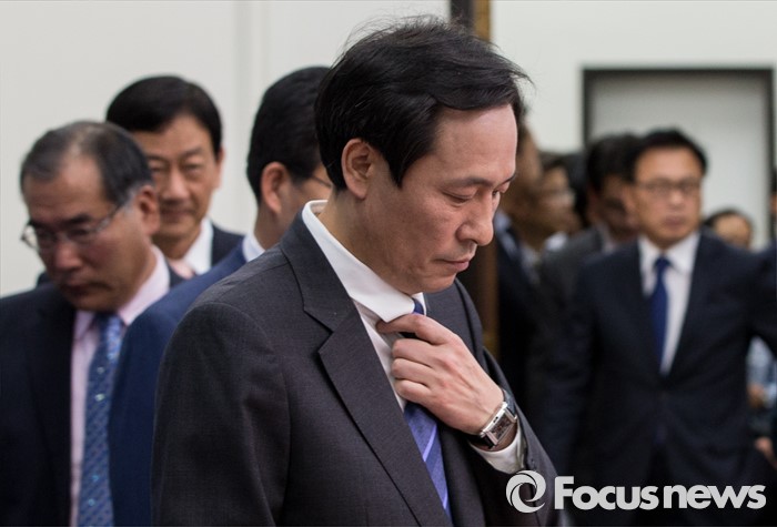 (서울=포커스뉴스) 16일 오전 서울 여의도 국회에서 열린 더불어민주당 제34차 비상대책위원회의에 우상호(맨 앞) 원내대표를 비롯한 비대위원들이 입장하고 있다.