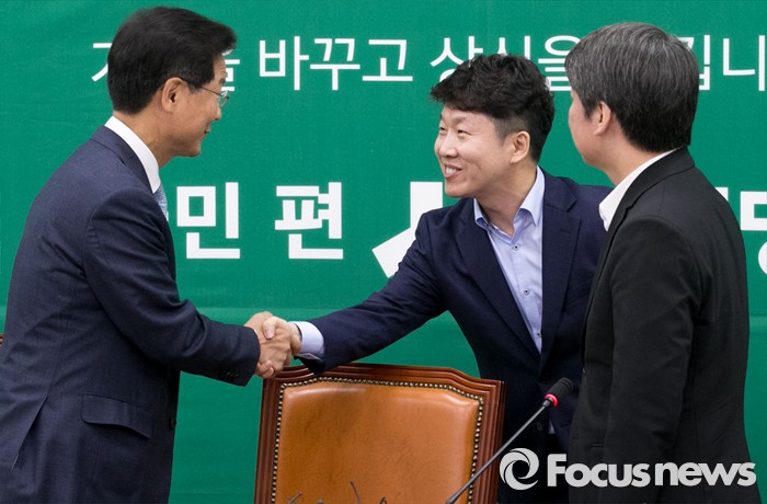 (서울=포커스뉴스) 16일 오전 서울 여의도 국회에서 열린 국민의당 최고위원회의에 천정배(왼쪽) 공동대표와 국민대표로 참석해 발언을 마친 황인국(가운데) 한국청소년재단 상임이사가 인사하고 있다. 오른쪽은 안철수 상임공동대표.