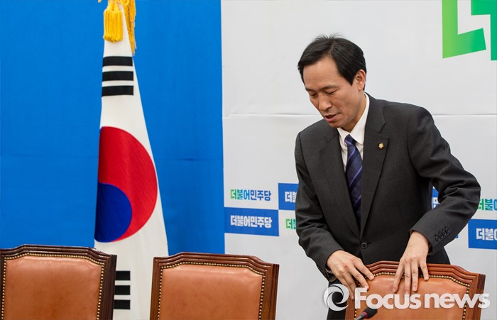 (서울=포커스뉴스) 16일 오전 서울 여의도 국회 더불어민주당 원내대표회의실에서 우상호 원내대표가 최문순 강원도지사와의 면담을 기다리며 자리를 정돈하고 있다.