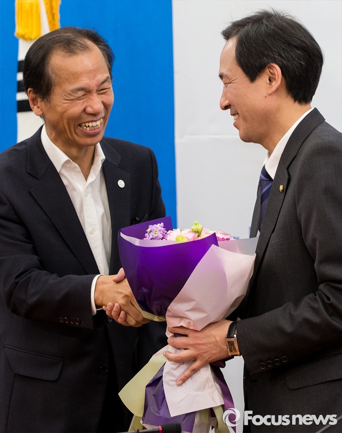 (서울=포커스뉴스) 16일 오전 서울 여의도 국회 더불어민주당 원내대표회의실을 방문한 최문순 강원도지사가 우상호 원내대표에게 당선 축하 꽃다발을 받은 후 악수하고 있다.