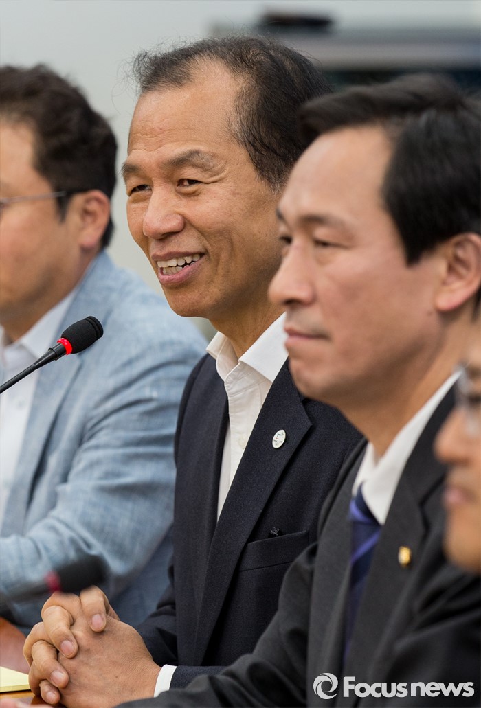 (서울=포커스뉴스) 16일 오전 서울 여의도 국회 더불어민주당 원내대표회의실을 방문한 최문순 강원도지사 인사말을 하고 있다.