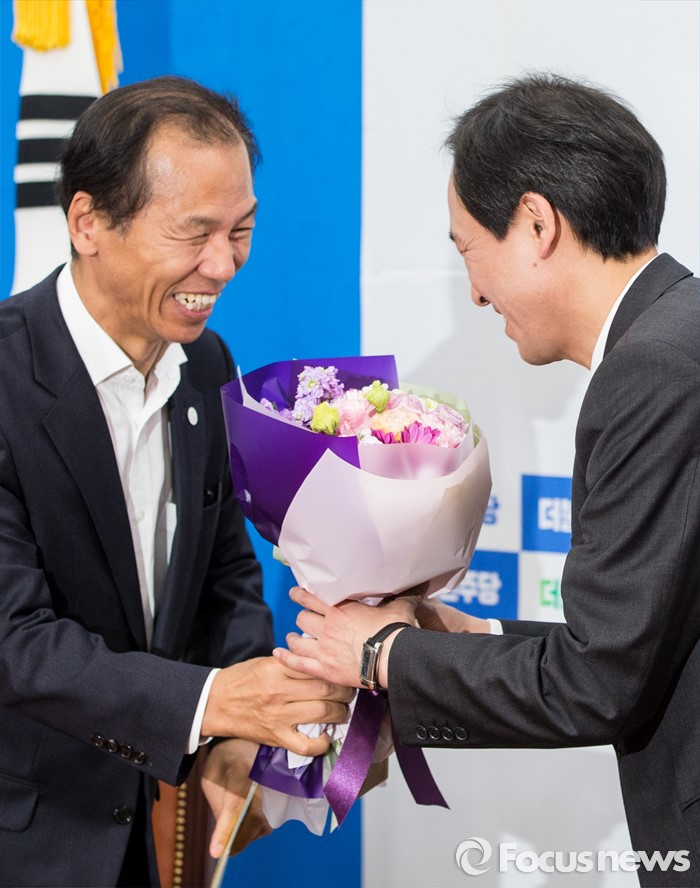 (서울=포커스뉴스) 16일 오전 서울 여의도 국회 더불어민주당 원내대표회의실을 방문한 최문순 강원도지사가 우상호 원내대표에게 당선 축하 꽃다발을 건네고 있다.