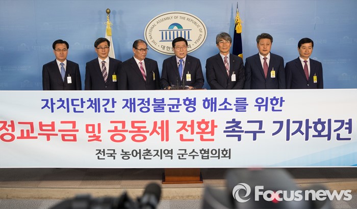 (서울=포커스뉴스) 한상기 태안군수를 비롯한 전국 농어촌지역 군수협의회 회장단이 16일 오전 서울 여의도 국회 정론관에서 정부의 지방재정개혁 이행 촉구 기자회견을 하고 있다.