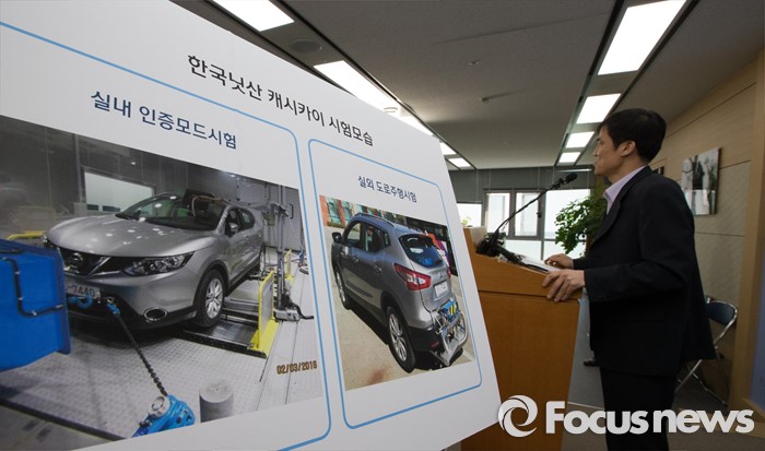 (세종=포커스뉴스) 홍동곤 환경부 교통환경과장이 16일 오전 세종시 정부세종청사 환경부 기자실에서 브리핑을 열고 지난해 12월부터 지난 4월까지 150일 동안 국내에서 판매된 경유자동차 20종을 조사한 결과 한국닛산 캐시카이 차량의 배기가스를 불법 조작하는 임의설정 한 것으로 판단된다고 밝히고 있다. 환경부는 한국닛산에 3억3000만원의 과징금 부과와 함께 판매정지 및 리콜(814대) 명령을 내릴 계획이다.