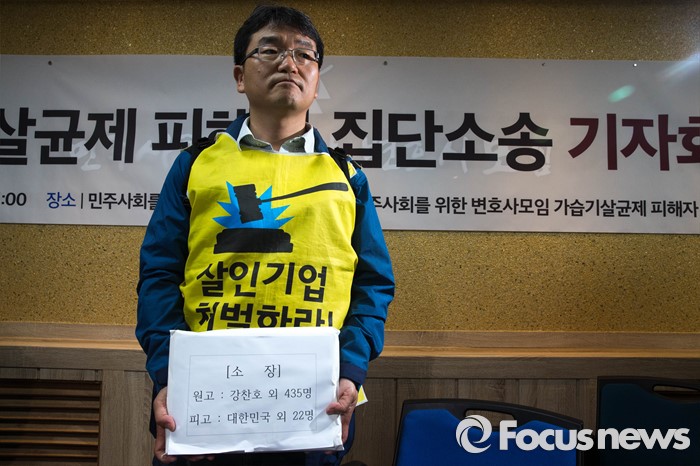 (서울=포커스뉴스) 16일 오전 서울 서초구 민변 대회의실에서 열린 가습기살균제피해자 공동소송대리인단의 집단소송 소장 접수 기자회견에서 피해자 대표 강찬호씨가 소장을 들고 취재진을 바라보고 있다.
