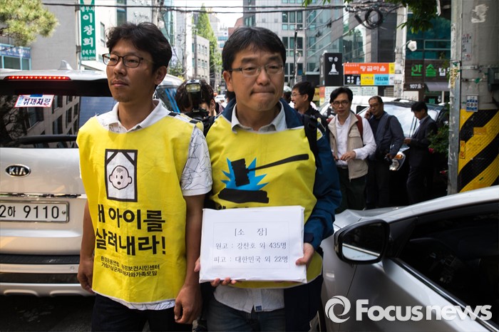 (서울=포커스뉴스) 16일 오전 서울 서초구 민변 대회의실에서 열린 가습기살균제피해자 공동소송대리인단의 집단소송 소장 접수 기자회견이 끝난 후 피해자 대표들이 소장을 들고 법원으로 향하고 있다.