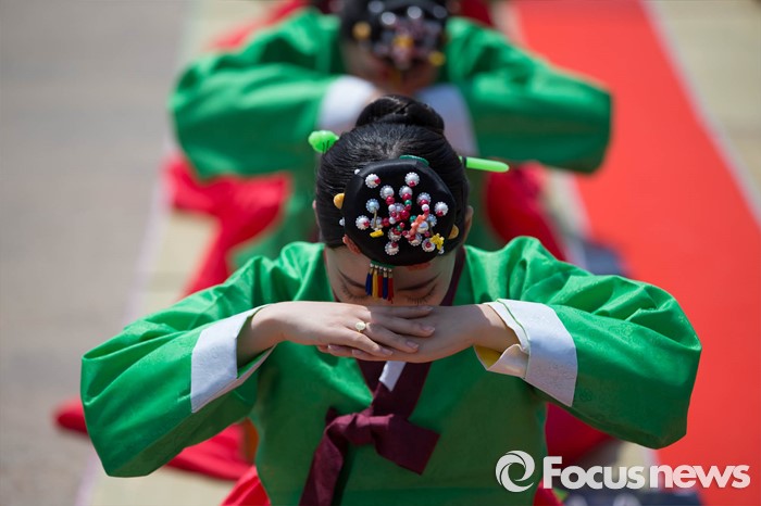 (서울=포커스뉴스) 16일 오전 서울 중구 남산골 한옥마을 천우각 광장에서 열린 제44회 성년의 날 행사에 참석한 학생들이 전통 성년례를 올리고 있다.