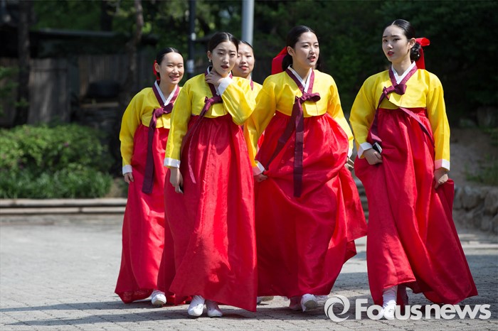 (서울=포커스뉴스) 16일 오전 서울 중구 남산골 한옥마을 천우각 광장에서 열린 제44회 성년의 날 행사에 참석한 학생들이 행사장으로 향하고 있다.