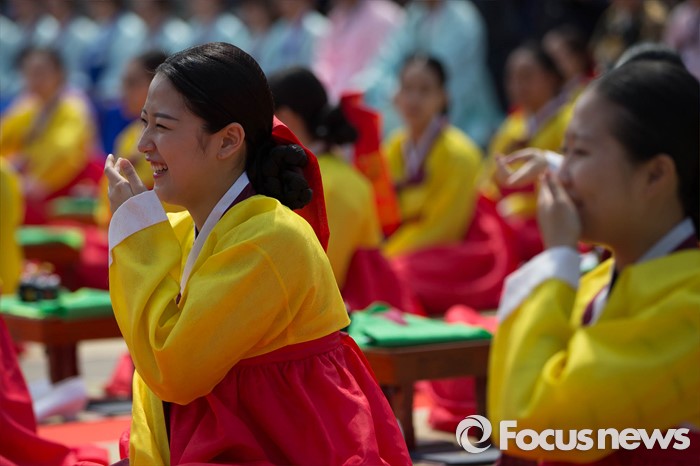 (서울=포커스뉴스) 16일 오전 서울 중구 남산골 한옥마을 천우각 광장에서 열린 제44회 성년의 날 행사에 참석한 학생들이 전통 성년례를 올리고 있다.