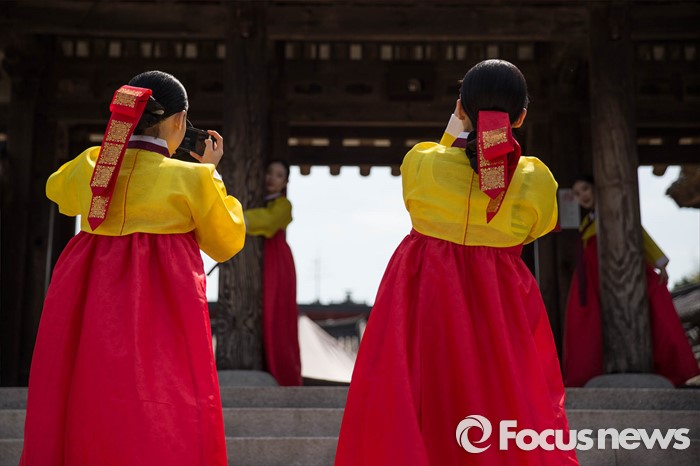 (서울=포커스뉴스) 16일 오전 서울 중구 남산골 한옥마을 천우각 광장에서 열린 제44회 성년의 날 행사에 참석한 학생들이 행사에 앞서 사진을 찍고 있다.