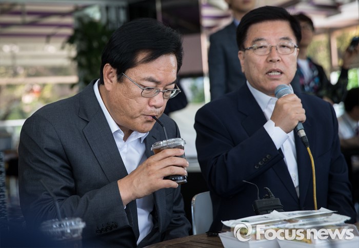 (서울=포커스뉴스) 정진석(왼쪽) 새누리당 원내대표가 16일 오후 서울 여의도 한강공원의 한 카페에서 열린'3040여성당직자 브라운백 미팅'에서 커피를 마시고 있다.