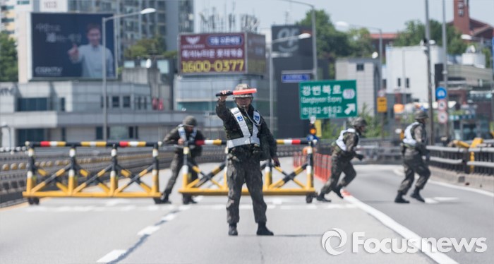 (서울=포커스뉴스) 제401차 민방위의 날인 16일 오후 서울 용산구 반포대교에서 군·경 관계자들이 합동 전시 교통통제소 설치 민방공대피훈련을 하고 있다.