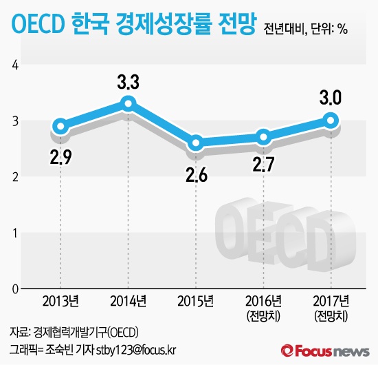 (서울=포커스뉴스) 경제협력개발기구(OECD)가 올해 한국 경제성장률(GDP) 전망치를 종전의 3.1%에서 2.7%로 하향조정했다. 내년 경제성장률 역시 기존 3.6%에서 3.0%로 낮췄다.