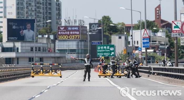 (서울=포커스뉴스) 제401차 민방위의 날인 16일 오후 서울 용산구 반포대교에서 군·경 관계자들이 합동 전시 교통통제소 설치 민방공대피훈련을 하고 있다.