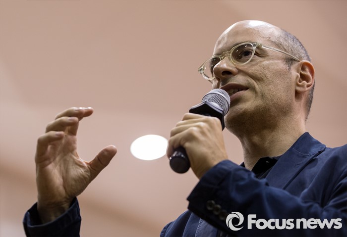 (서울=포커스뉴스) 16일 오후 서울 종로구 서울예술고등학교를 찾은 프랑스 작가 베르나르 베르베르가 '오늘날의 예술적 지능'이란 주제로 학생들에게 강연하고 있다.