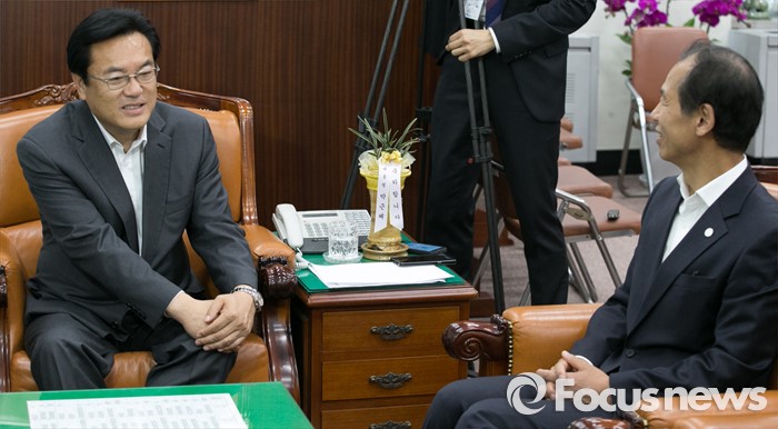 (서울=포커스뉴스) 정진석(왼쪽) 새누리당 원내대표가 16일 오후 서울 여의도 국회를 방문한 최문순 강원도지사와 만나 면담을 하고 있다.