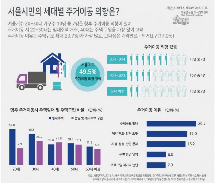16일 서울연구원 인포그래픽스 '서울시민의 세대별 주거이동 의향은?'에 따르면 향후 주거이동 의향을 묻는 설문조사에서 서울 가구의 절반 정도에 해당하는 45.5%가 주거이동 의향이 있다고 답했다.