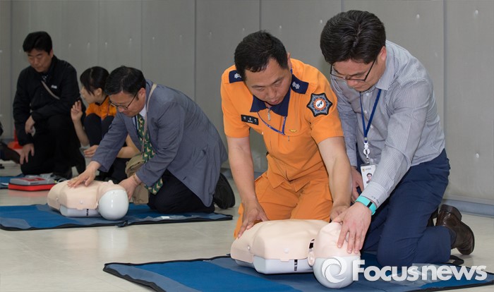 (세종=포커스뉴스) 16일 오후 세종시 정부세종청사에서 공무원들이 민방위의 날을 맞아 실시된 제401차 민방공 대피훈련에 참가해 심폐소생술 교육을 받고 있다.