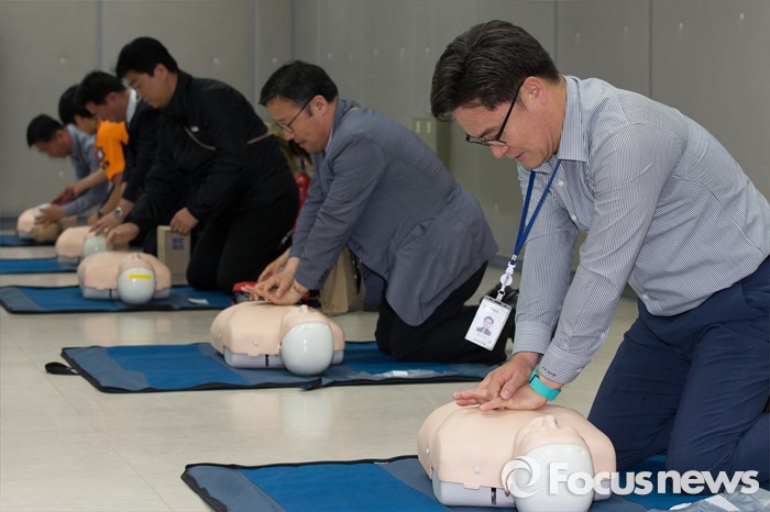(세종=포커스뉴스) 16일 오후 세종시 정부세종청사에서 공무원들이 민방위의 날을 맞아 실시된 제401차 민방공 대피훈련에 참가해 심폐소생술 교육을 받고 있다.