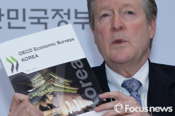 (세종=포커스뉴스) 랜달 존스(Randall Jones) OECD 사무국 선임이코노미스트가 16일 오후 세종시 정부세종청사 기획재정부 브리핑룸에서 OECD 한국경제보고서를 발표하고 있다.