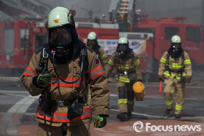 (서울=포커스뉴스) 16일 오후 서울 송파구 제2롯데월드몰에서 소방관들이 '재난대응 안전한국훈련'에 참가해 화재진압 훈련을 하고 있다.