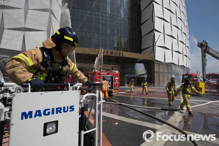 (서울=포커스뉴스) 16일 오후 서울 송파구 제2롯데월드몰에서 소방관들이 '재난대응 안전한국훈련'에 참가해 화재진압 훈련을 하고 있다.