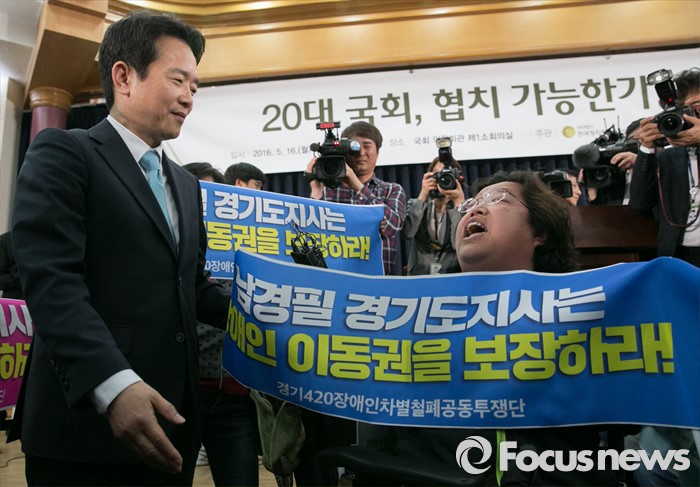 (서울=포커스뉴스) 16일 오후 서울 여의도 국회 의원회관에서 열린 '20대 국회, 협치 가능한가' 토론회에 참석한 남경필 경기도지사의 인사말 도중 장애인 이동권 보장을 요구하는 경기420장애인차별철폐공동투쟁단 등이 남 지사와 면담을 요구하며 손피켓을 들고 있다.
