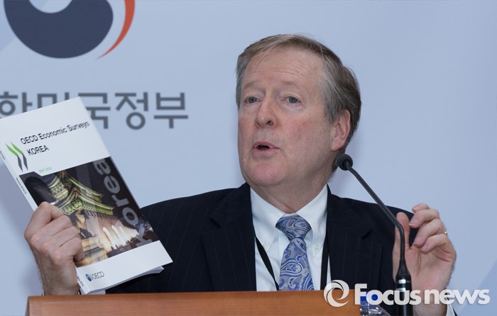 (세종=포커스뉴스) 랜달 존스(Randall Jones) OECD 사무국 선임이코노미스트가 16일 오후 세종시 정부세종청사 기획재정부 브리핑룸에서 OECD 한국경제보고서를 발표하고 있다.