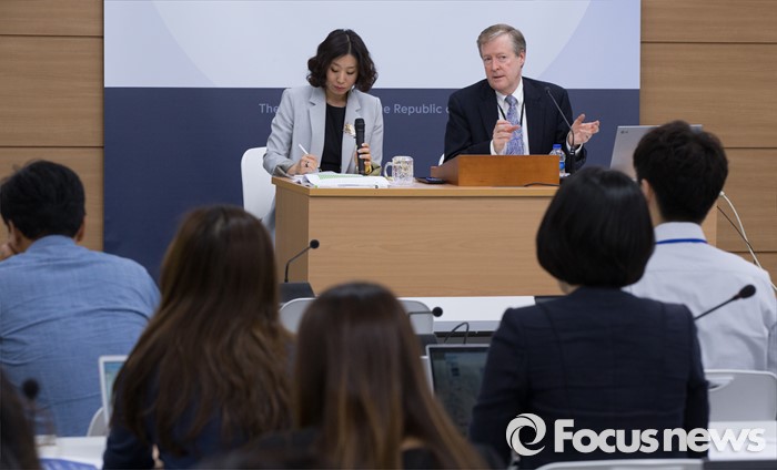 (세종=포커스뉴스) 랜달 존스(Randall Jones) OECD 사무국 선임이코노미스트가 16일 오후 세종시 정부세종청사 기획재정부 브리핑룸에서 OECD 한국경제보고서를 발표하고 있다.