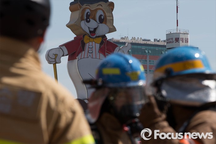 (서울=포커스뉴스) 16일 오후 서울 송파구 제2롯데월드몰에서 소방관들이 '재난대응 안전한국훈련'에 참가해 화재진압 훈련을 하고 있다.