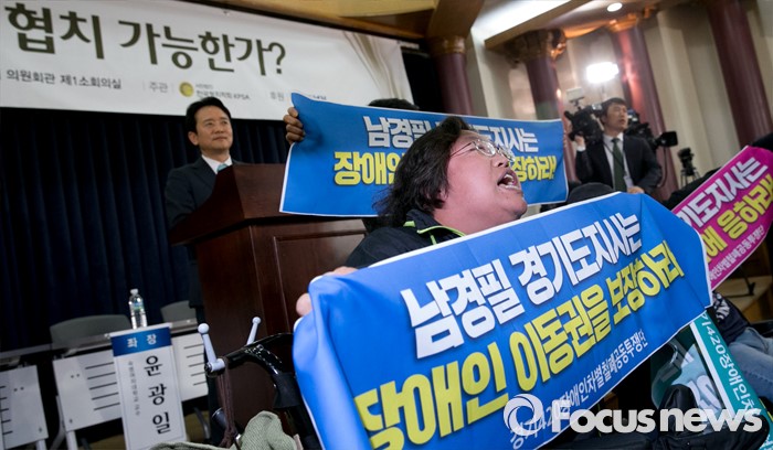 (서울=포커스뉴스) 16일 오후 서울 여의도 국회 의원회관에서 열린 '20대 국회, 협치 가능한가' 토론회에 참석한 남경필 경기도지사의 인사말 도중 장애인 이동권 보장을 요구하는 경기420장애인차별철폐공동투쟁단 등이 남 지사와 면담을 요구하며 손피켓을 들고 있다.