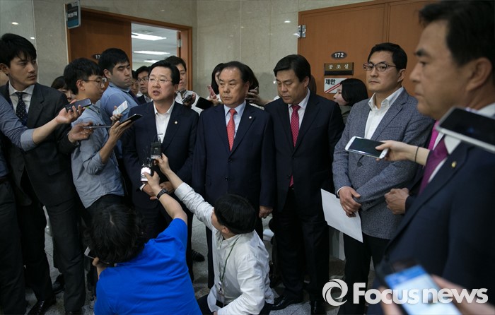 (서울=포커스뉴스) 16일 오후 서울 여의도 국회 정론관에서 새누리당 초·재선 의원 및 당선인들이 당 혁신위와 비대위원 재검토를 요구하는 성명서 발표 기자회견을 마친 뒤 취재진 질문에 답하고 있다. 왼쪽부터 이장우, 이우현 의원, 김선동 당선인, 박대출, 김태흠 의원.